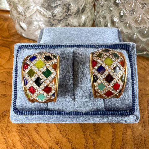 Vintage Enamel & Diamond Clip Hoop Earrings