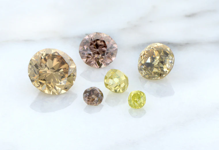 Diamonds naturally come in many different colors, from yellow to pink to blue. The majority are colorless to slightly colored and are graded on the D through Z color scale. D represents a colorless diamond while Z represents a diamond that is significantly colored, typically in shades of yellow or brown. Most diamonds fall somewhere in between, gaining more color saturation as they move further down the alphabet. Diamonds with very saturated color are called Fancy, including Fancy Yellow or Fancy Brown, and are graded on a different color scale. The Fancy color scale measures the stone's hue, tone, and saturation.