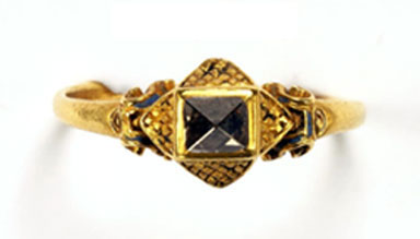 The first faceted diamonds are used in jewelry. They are mostly point cuts along with some table cuts. Photo credit Victoria and Albert Museum.