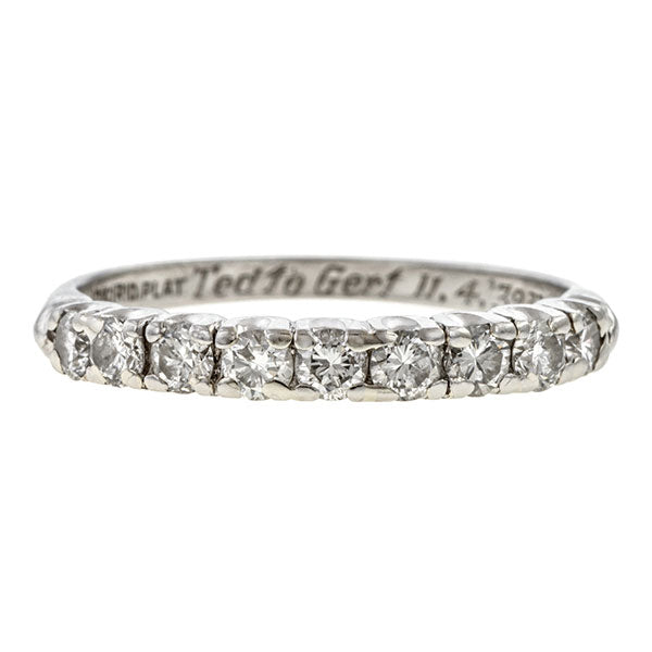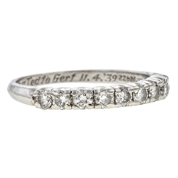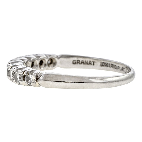 Measuring approx. 2.5mm wide, set with nine Round Brilliant cut diamonds weighing approx. 0.45ctw., fashioned in platinum. Stamped "10% IRID. PLAT". Stamped "GRANAT". Hand engraved with date "11.4, '39". Size 5 1/4.